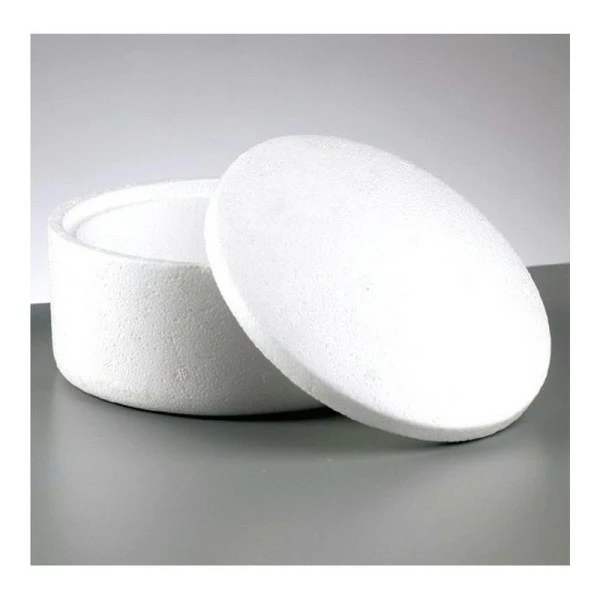 Description de Boite Ronde avec couvercle en polystyrène blanc, diamètre 14,5 cm et 9 cm de haut