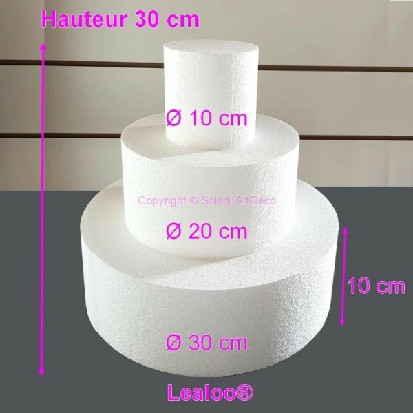 Description de Petite Pièce montée en polystyrène Hauteur 30 cm, Base Ø 30cm à 10cm, 3 disques de 10cm de haut