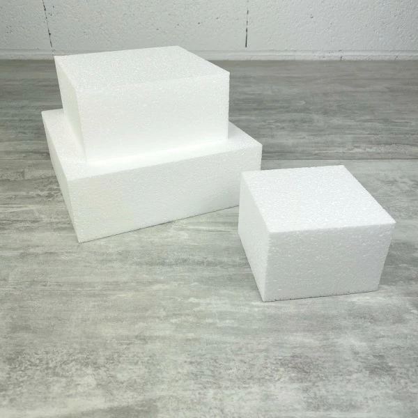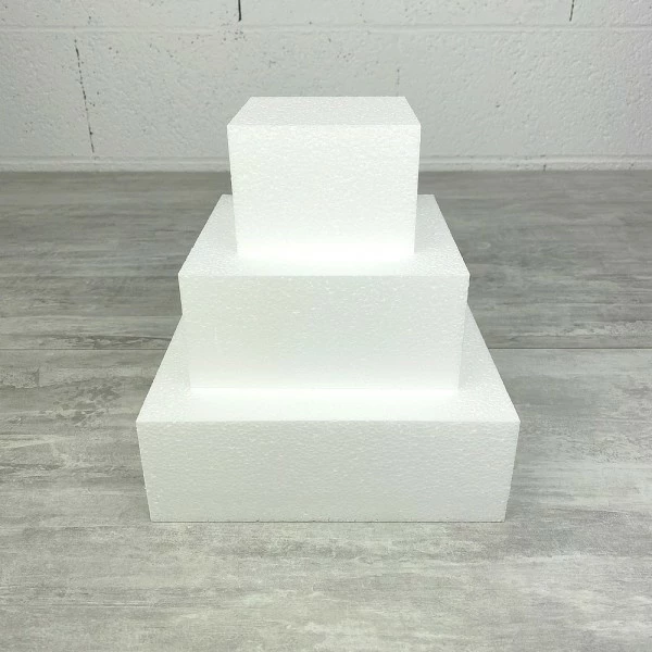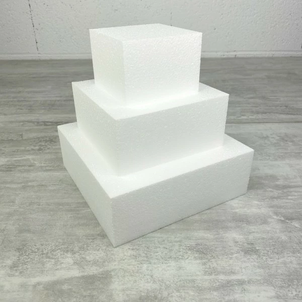 Description de Petite Pièce montée carrée en polystyrène 21 cm de haut, coté 20cm à 10cm, 3 étages en Styro x 7cm d
