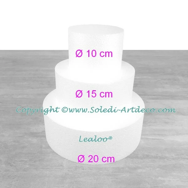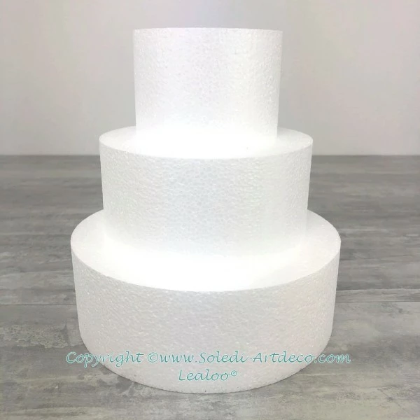 Description de Petite Pièce montée en polystyrène, Base Ø 20cm à 10cm, 3 disques de 7cm de haut, Hauteur totale 21c