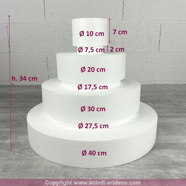 Description de Petite Pièce montée Wedding Cake, Hauteur 34 cm, Base Ø 40cm à 10cm, 4 étages en Polystyrène