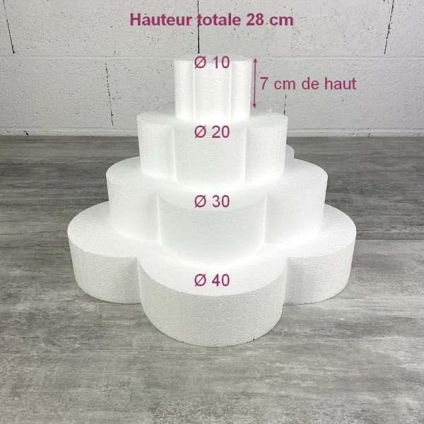 Description de Pièce montée Fleur en polystyrène plein, Hauteur 28 cm, Support 4 étages de 7 cm, Base du socle 40 c