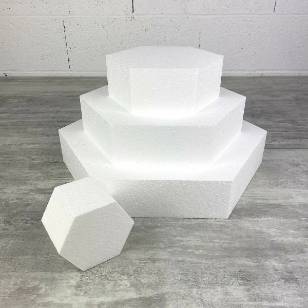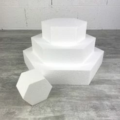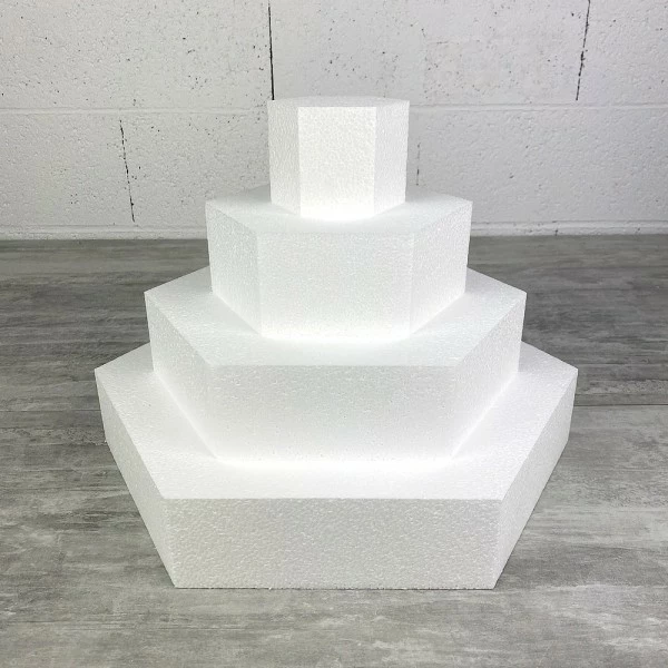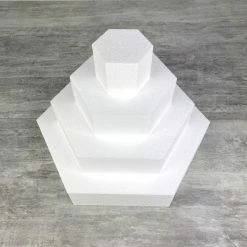 Description de Pièce montée Hexagonale en polystyrène, Base 40 cm à 10 cm, 4 socles de 7 cm de haut, Total 28 cm