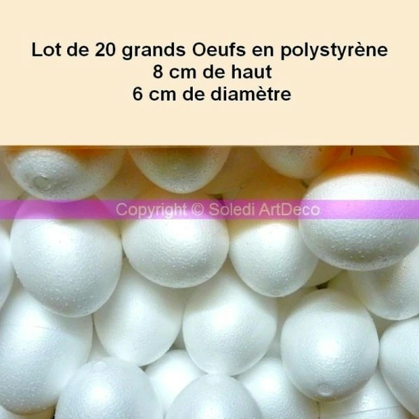 Description de Lot de 20 grands Oeufs en polystyrène plein 8 cm de haut, 6 cm de diamètre, Styro blanc