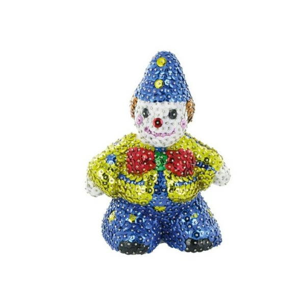 A titre indicatif, prévoir 6000 paillettes à facettes (ø 6mm) et autant d’épingles à piquer pour couvrir le clown en polystyrène.