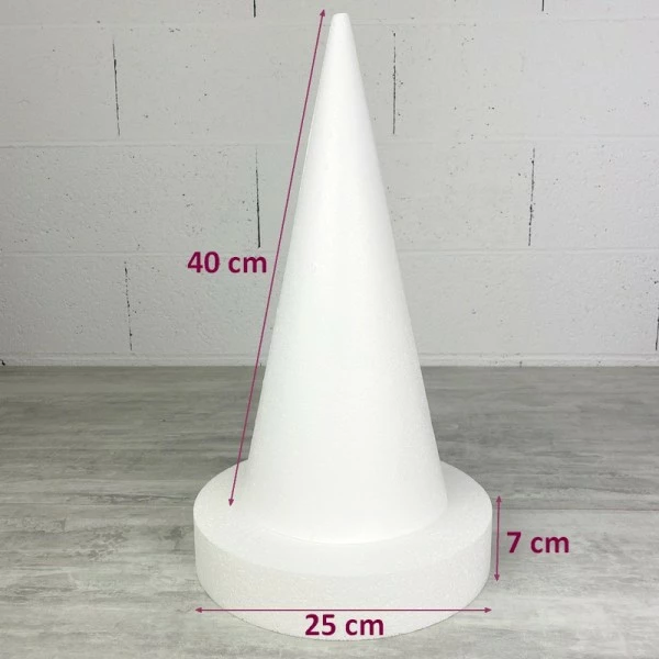 Description de Cône en polystyrène h. 40 cm avec support, disque diam. 25 cm, h. totale 45 cm, à décorer