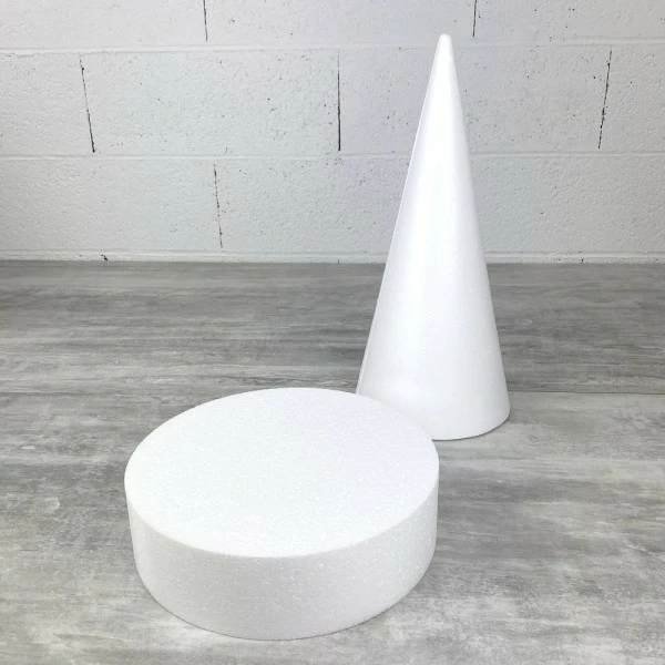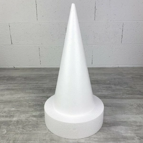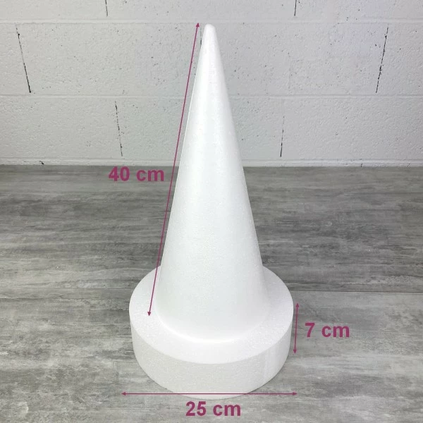 Description de Cône en polystyrène h. 40 cm avec support, disque diam. 25 cm, h. totale 47 cm, à décorer