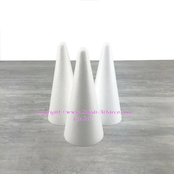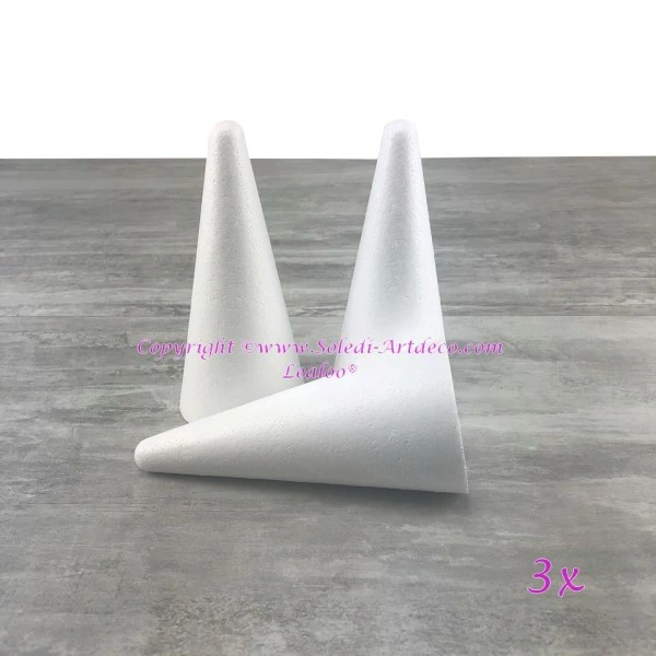 Description de Lot de 3 cônes en polystyrène de 20 cm de haut, Styropor blanc, Diamètre de la base 9 cm