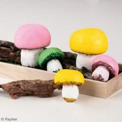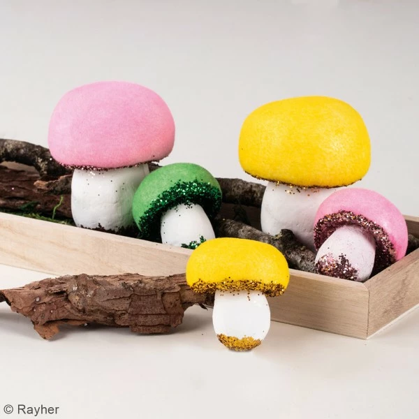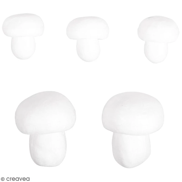 Cet assortiment de champignons en polystyrène à décorer contient 3 champignons en polystyrène de 4,5 x 5 cm et 2 champignons en polystyrène de 6 x 7,5 cm que vous pourrez décorer selon vos envies.